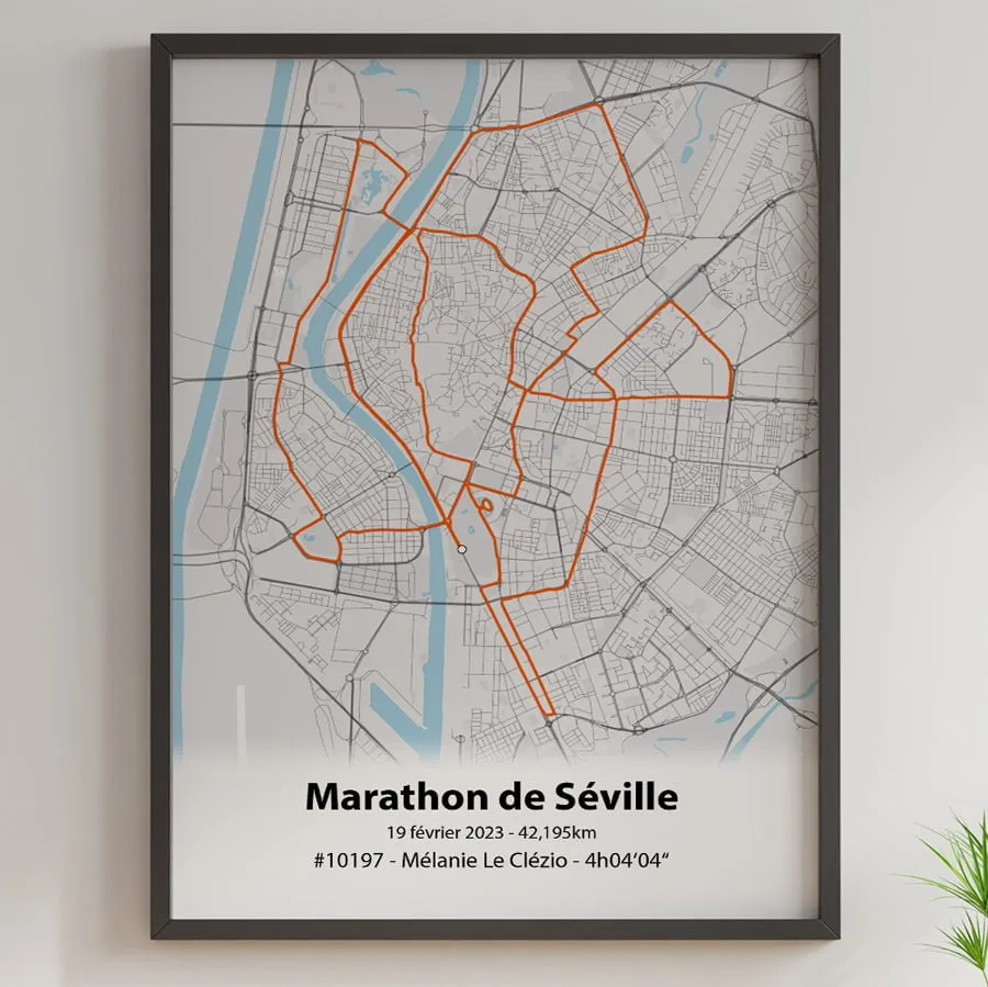 Cette affiche du parcours du marathon de Séville est imprimée sur du papier photo brillant haute qualité.