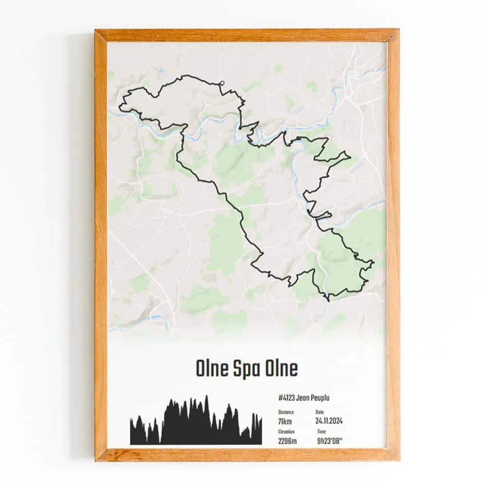 Cette affiche du parcours du trail Olne Spa Olne est imprimée sur du papier photo brillant haute qualité.