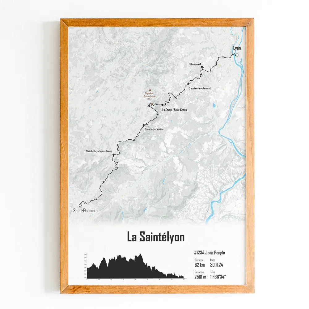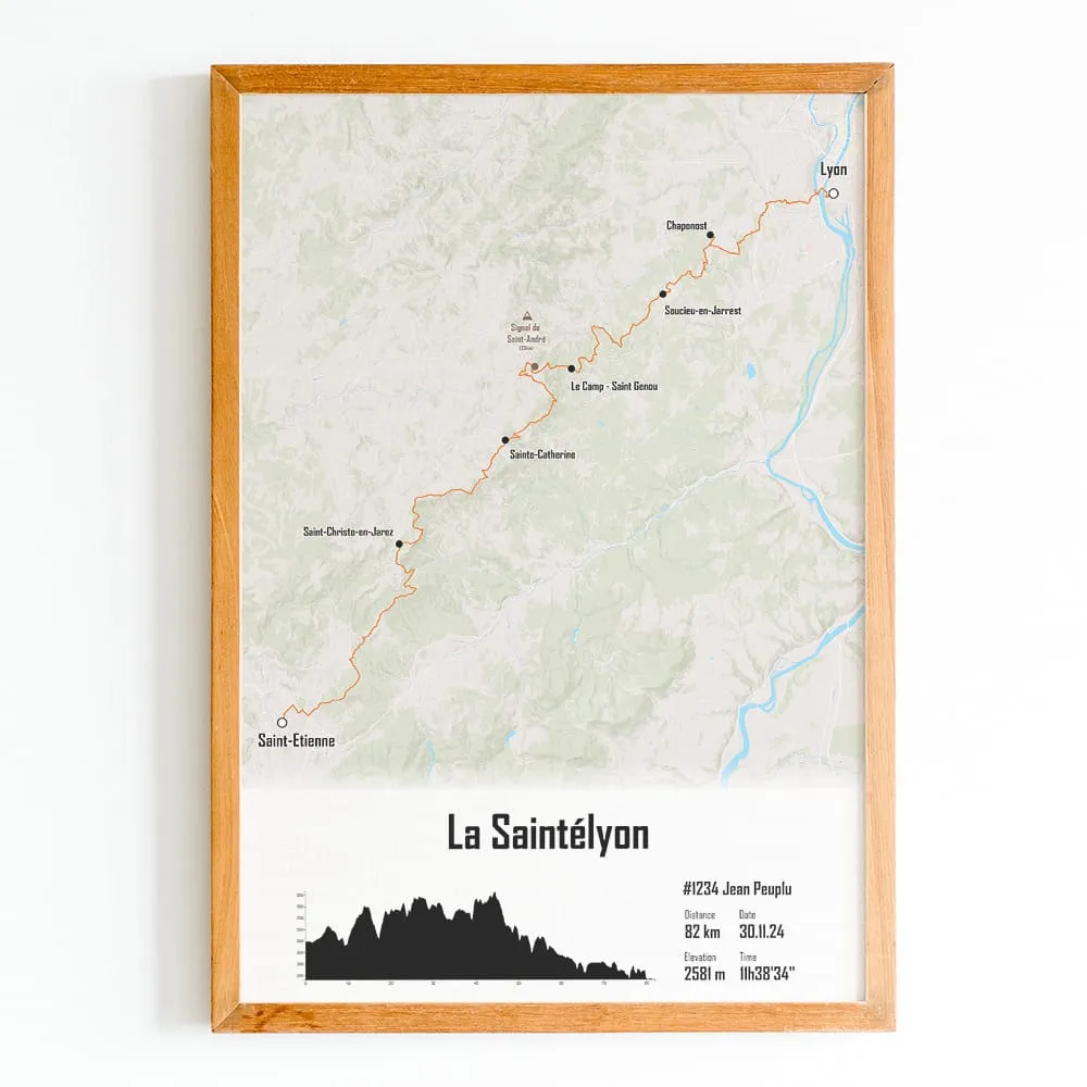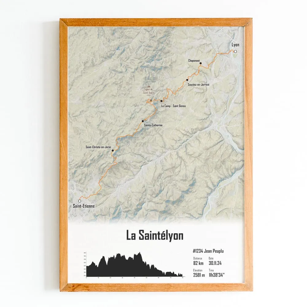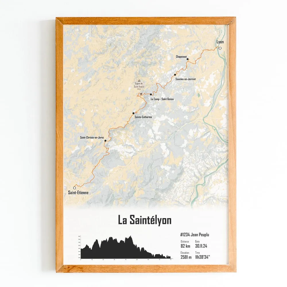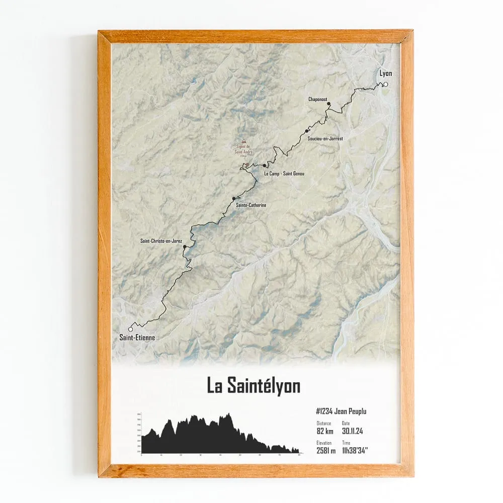 Affiche cartographiée de la Saintéyon. Cette impression du parcours est disponible en plusieurs tailles et en plusieurs couleurs de fond de carte et de trace. Sélectionnez les champs de texte et ajoutez votre nom, votre numéro de dossard, votre temps d’arrivée ou bien une photo pour créer votre affiche personnalisée de la Mythique Saintélyon.