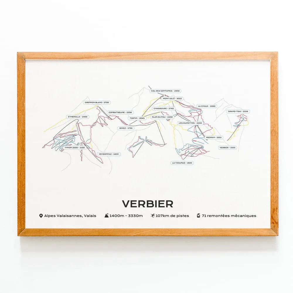 Cette affiche du plan des pistes du domaine skiable de la station de Verbier est imprimée sur du papier brillant haute qualité.