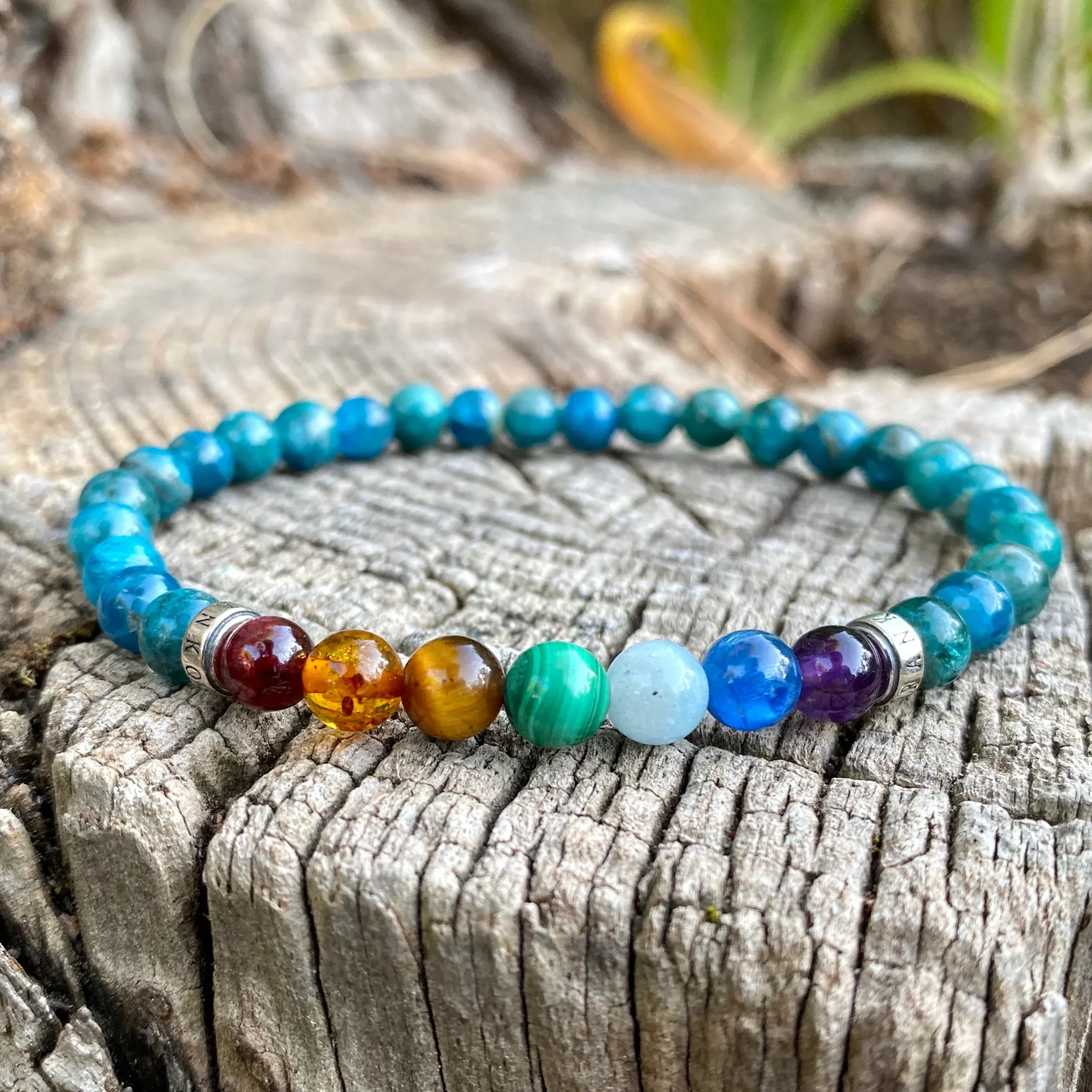 Bracelet représentant les 7 chakras réalisé parmi une sélection minutieuse de nos plus belles pierres (6mm). Il est composé principalement d’Apatite bleue et de 2 accessoires ANKORA en argent 925.