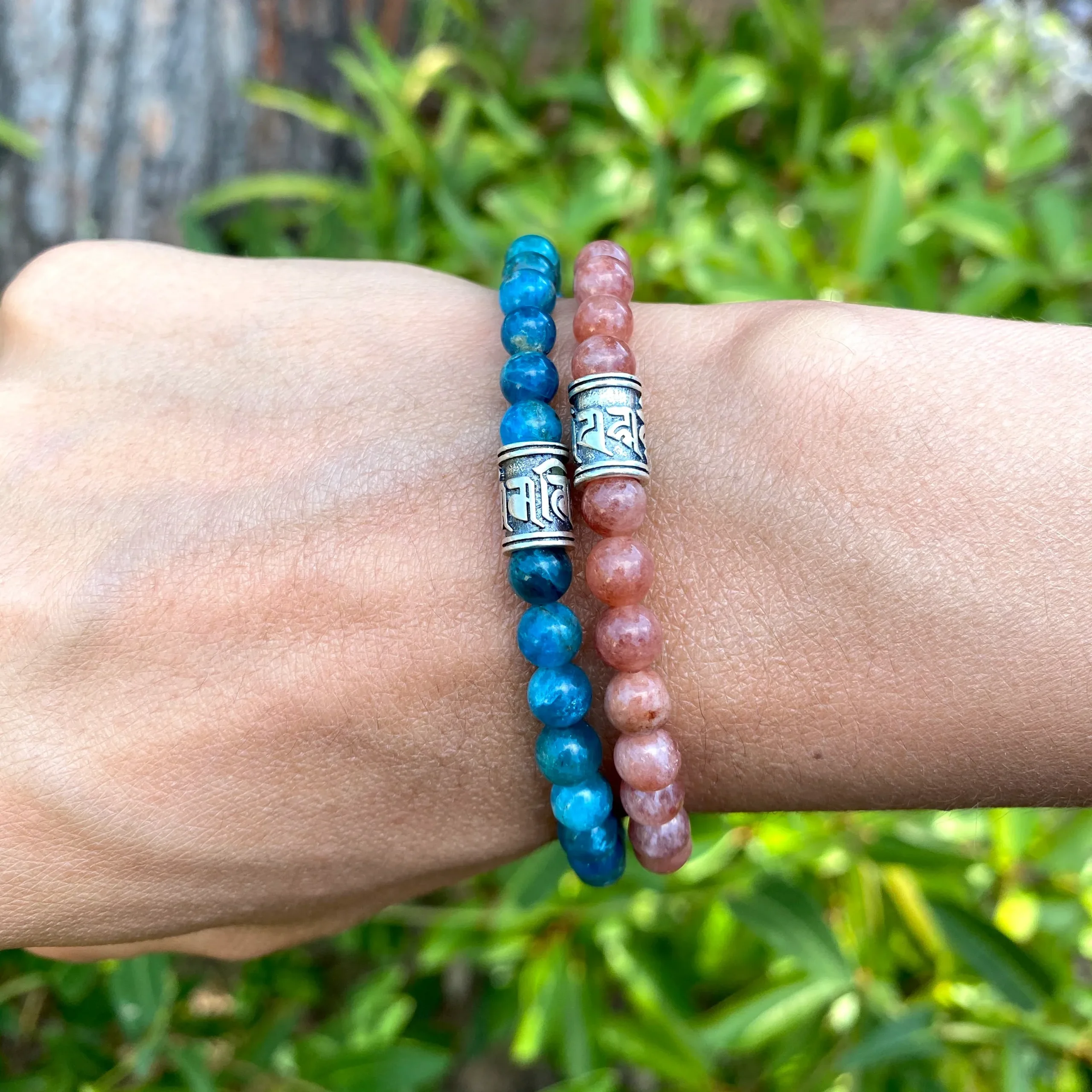 Bracelet mala bouddhiste réalisé à partir de Pierre de soleil de 6mm de diamètre, et d’un accessoire « Om Mani Padme Hum » en argent 925. Inspiré par les moulins à prières Tibétains, ce mantra représente à lui seul tous les enseignements de Bouddha.