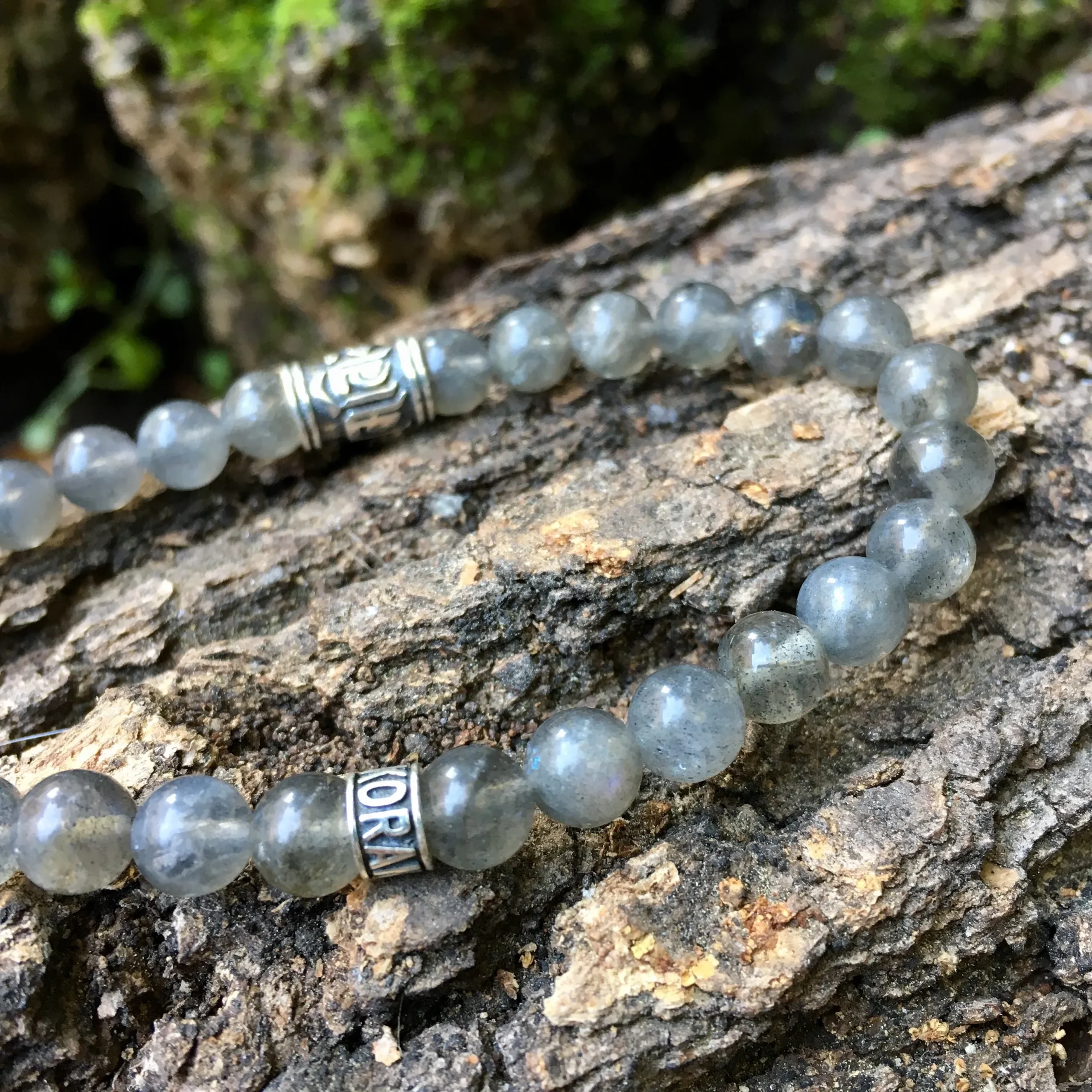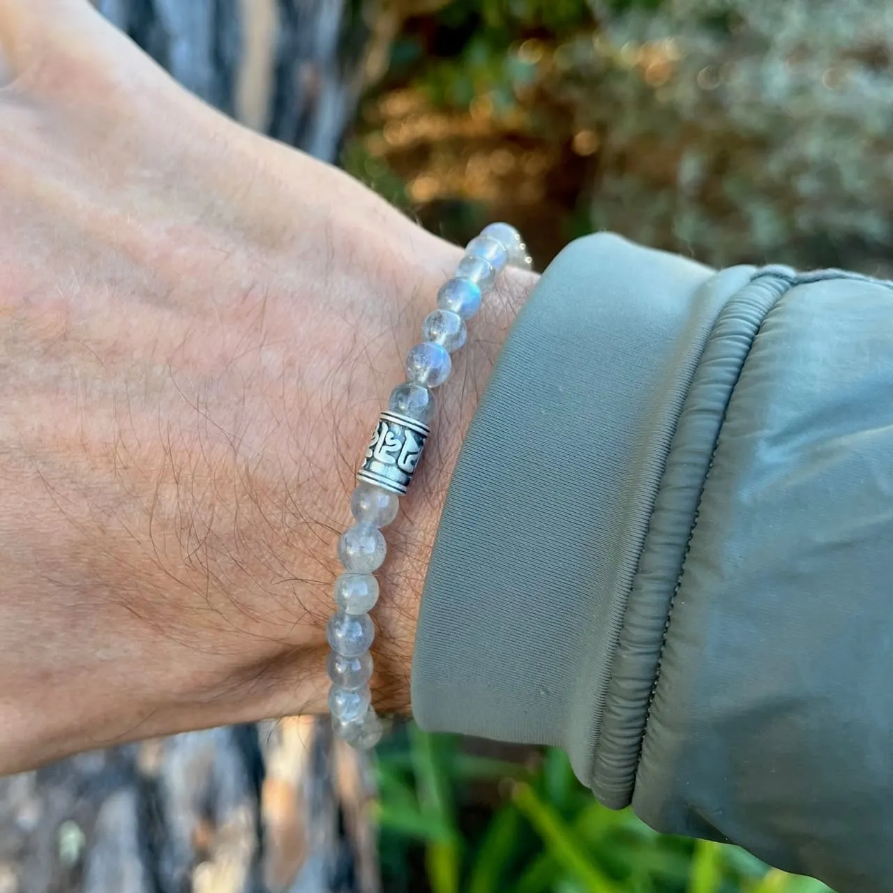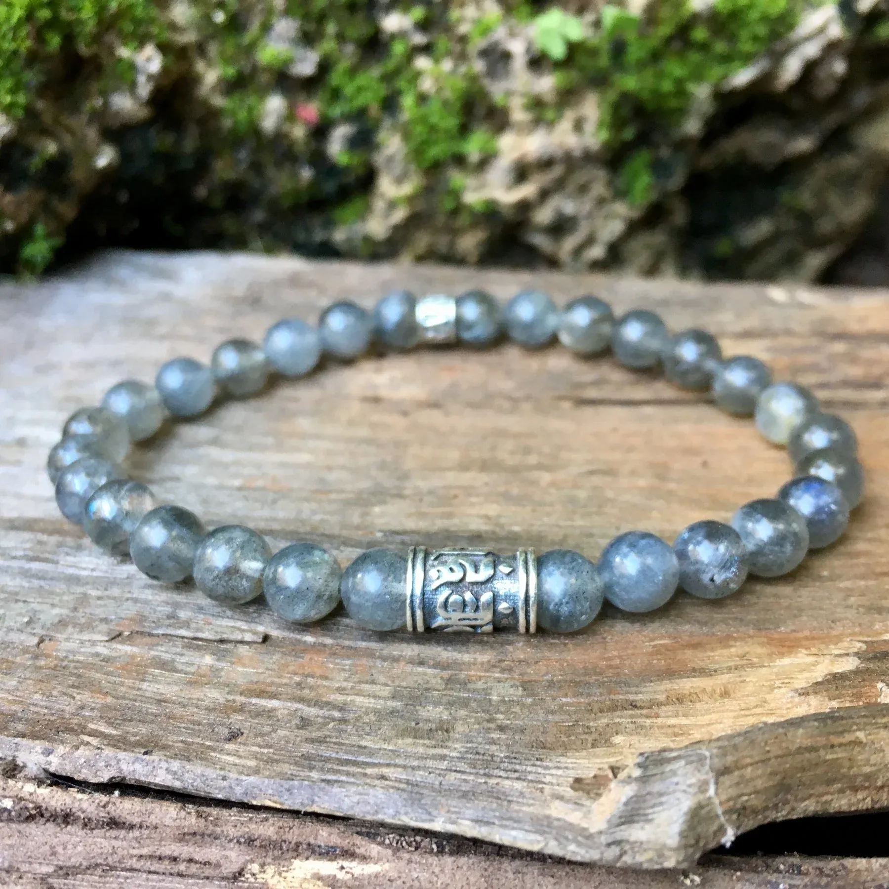 Bracelet réalisé avec des pierres naturelles en Labradorite de 6 mm de diamètre en provenance de Madagascar, et un accessoire Bouddhiste « Om Mani Padme Hum » en argent 925. Inspiré par les moulins à prières Tibétains, ce mantra représente à lui seul tous les enseignements du Bouddha.