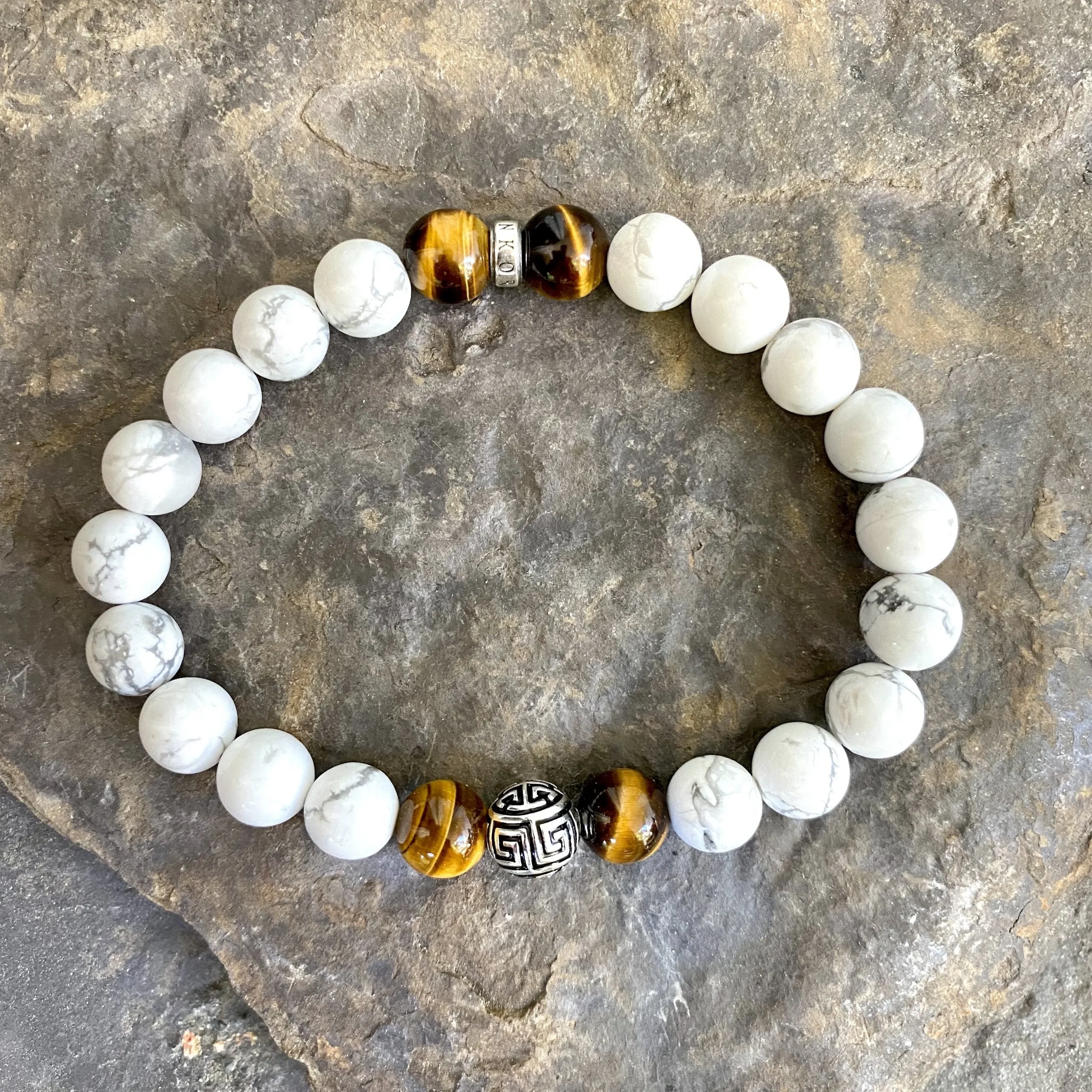 Bracelet réalisé à partir de pierres naturelles d’Howlite & d’Oeil de Tigre de 8 mm de diamètre, d’un accessoire ANKORA, et du blessing « LU » en argent 925. Symbole spirituel apportant Chance et Prospérité à celui qui le porte.