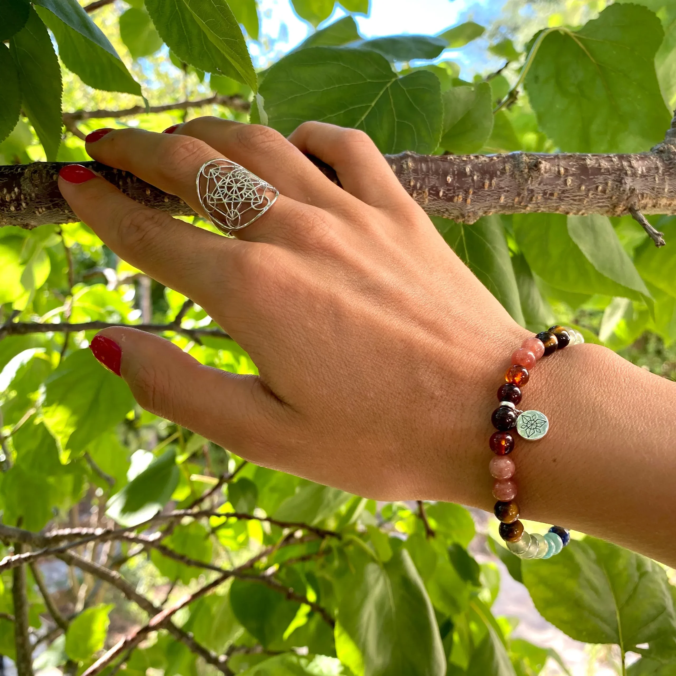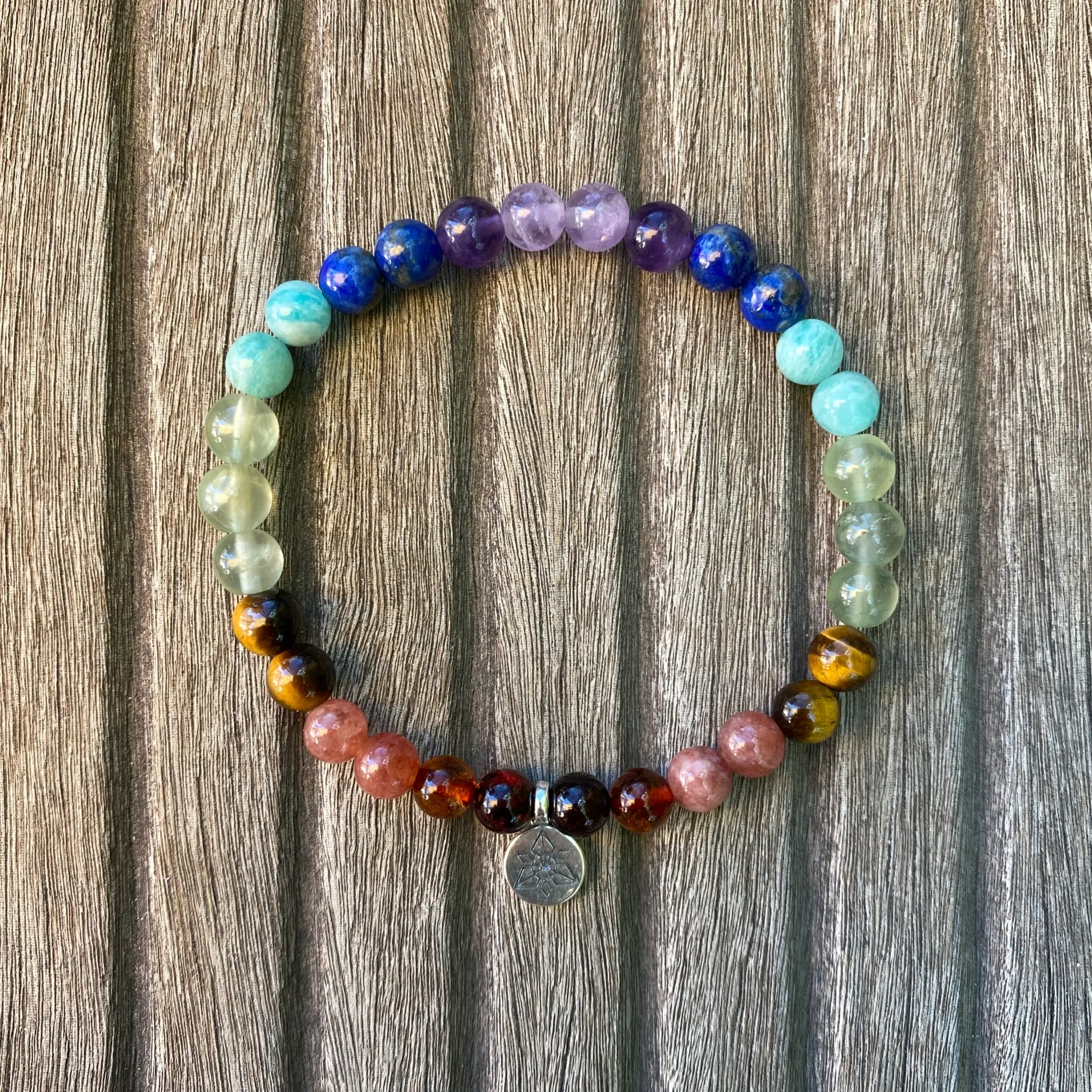 Bracelet composé de véritables pierres de 6 mm représentant les 7 chakras. Il a été réalisé parmi une sélection minutieuse de nos plus belles pierres. Composé d’un pendentif ANKORA en argent 925.