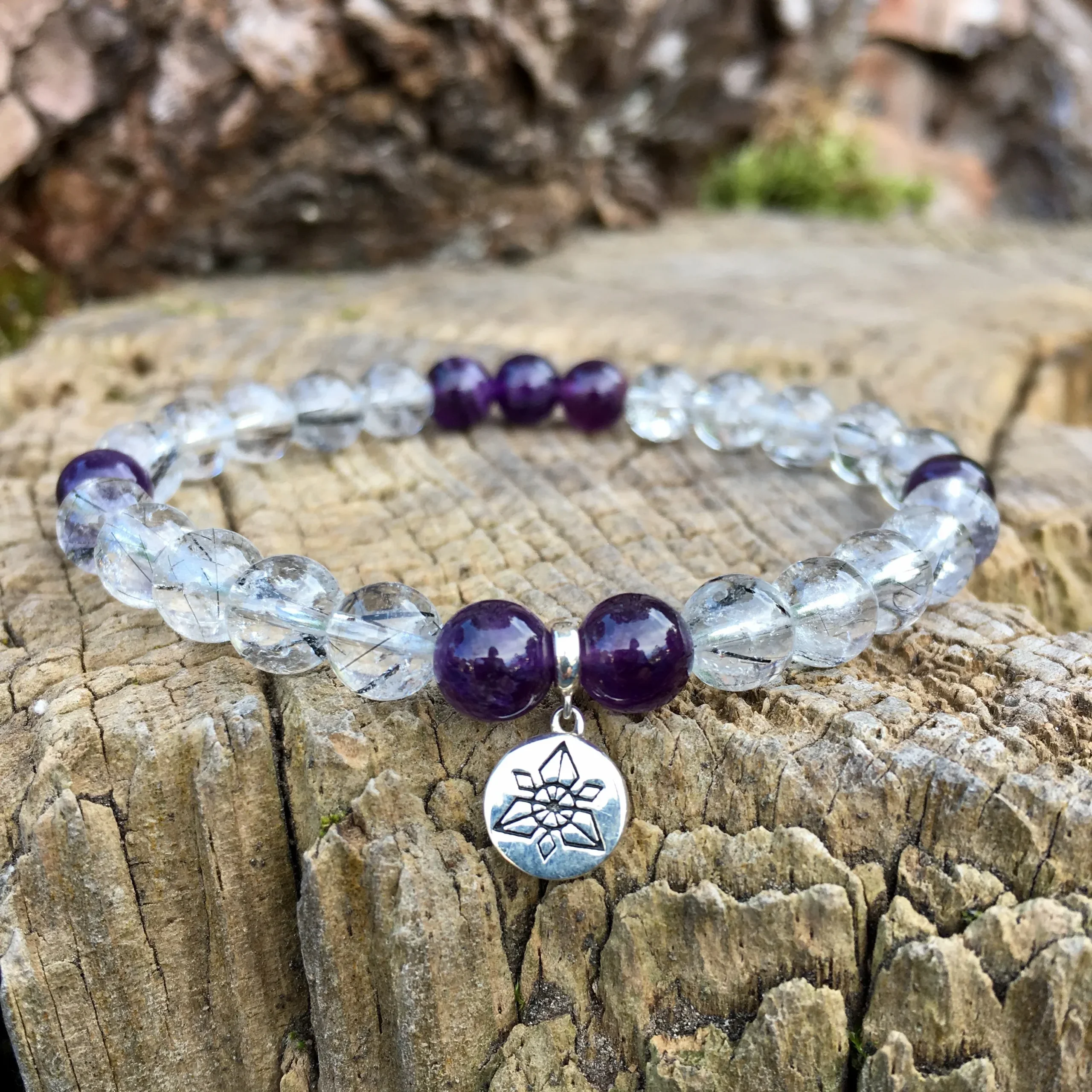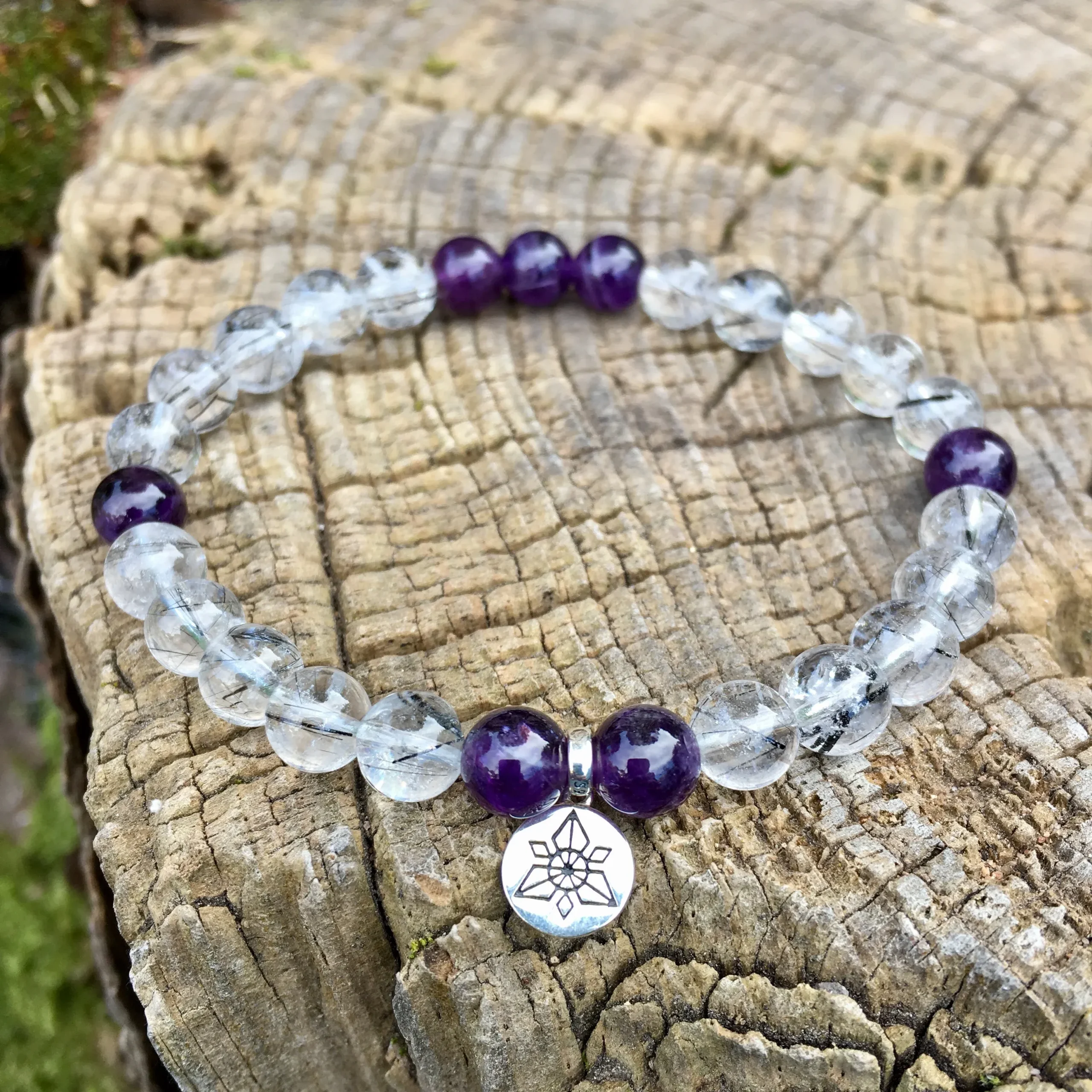 Bracelet femme réalisé à partir de pierres naturelles non teintées de 6mm de diamètre d’Améthyste en provenance de Bolivie, de Quartz Tourmaline de grade AAA, et d’un accessoire ANKORA en argent 925.