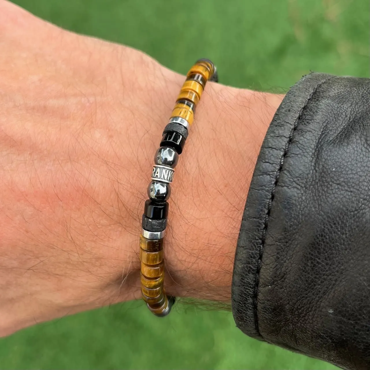 Bracelet Heishi composé de perles naturelles de 6 mm de diamètre, dont de l’Œil de tigre, de l’Agate noire, de la Pierre de lave, de l’Hématite, ainsi que d’un accessoire ANKORA en argent massif.