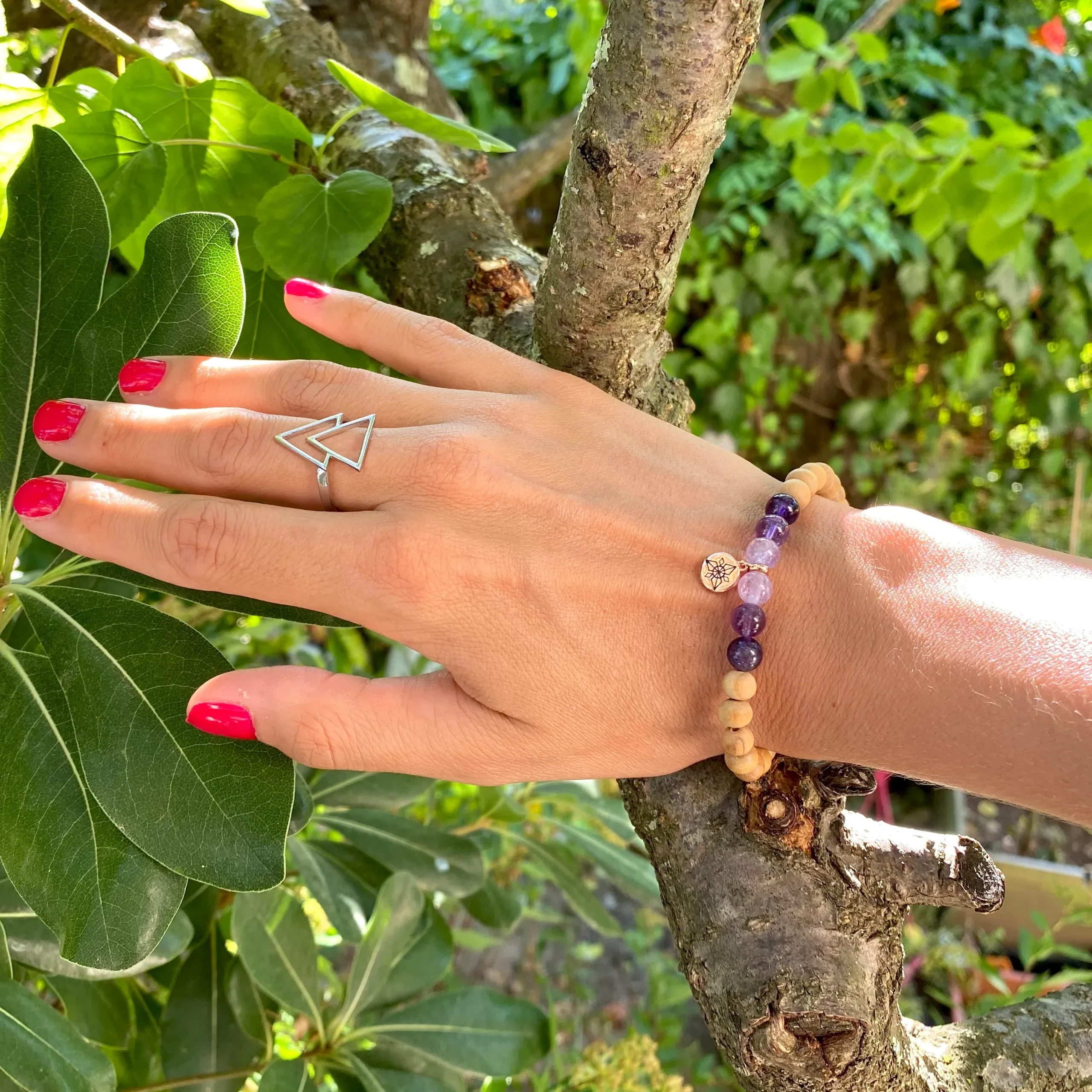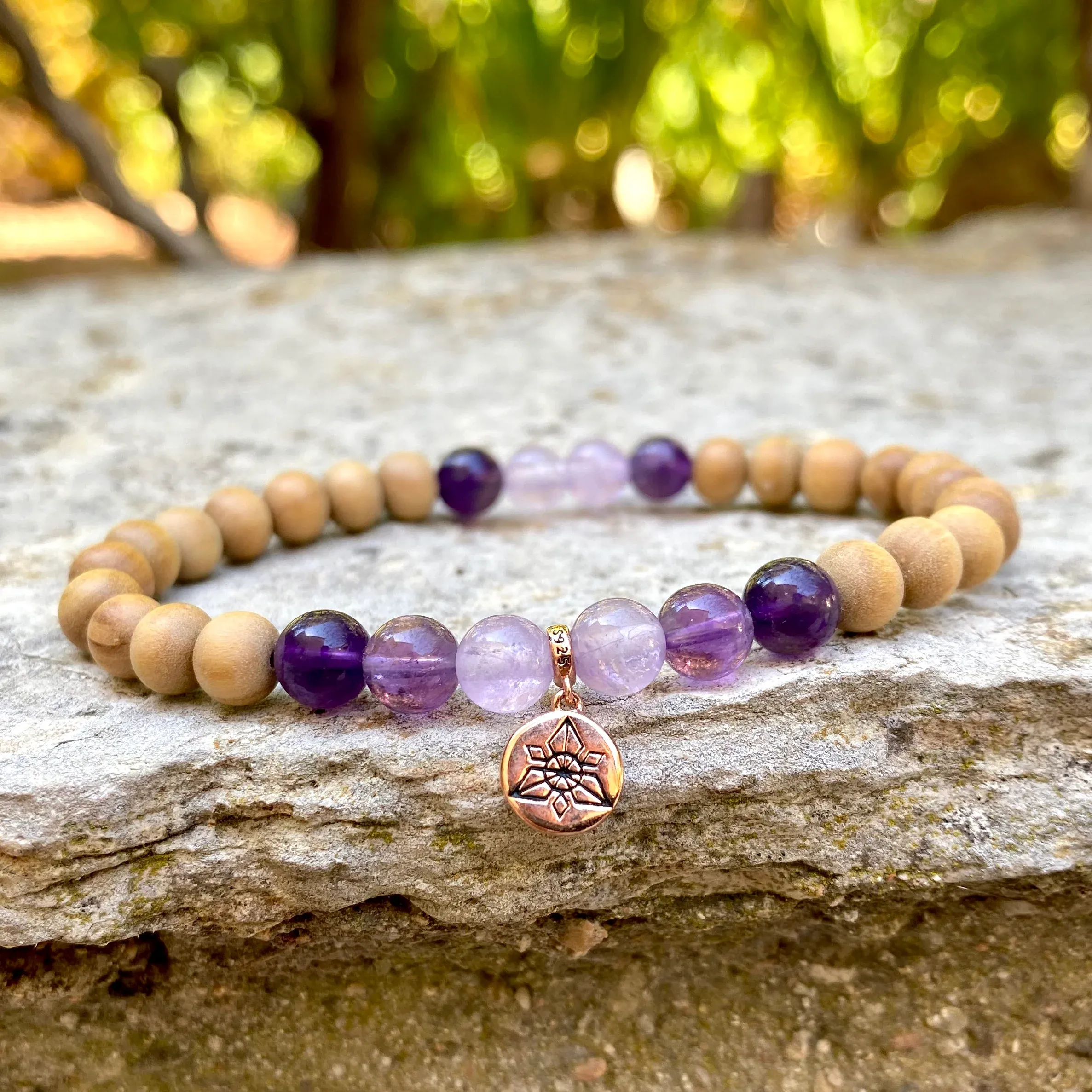 Bracelet réalisé à partir de plusieurs variétés d’Améthyste et du Bois de Santal de très grande qualité de 6mm de diamètre, en provenance d’Inde, dans la région du Mysore. Il est composé d’un pendentif ANKORA en argent 925 plaqué en or rose.