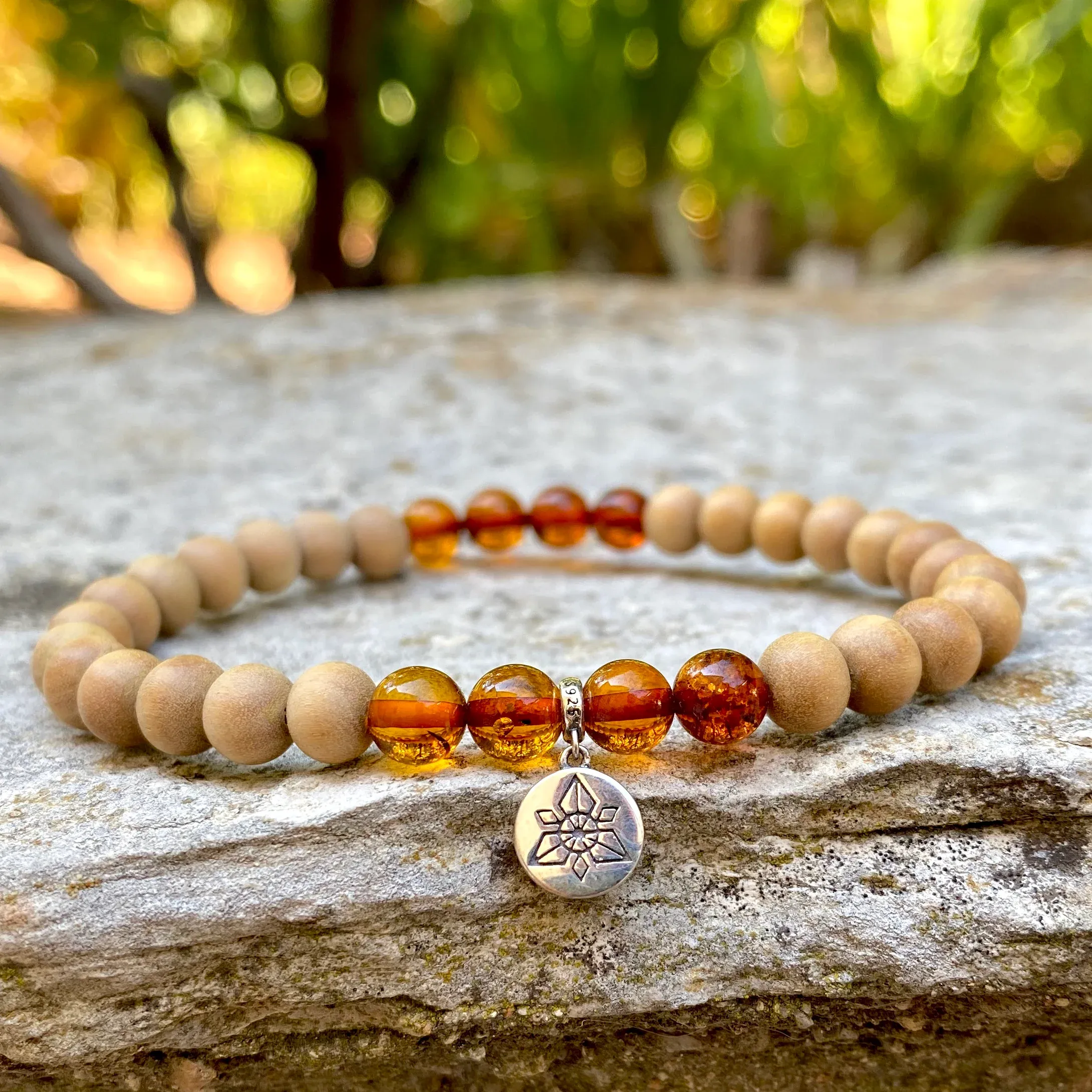 Bracelet pour femme réalisé à partir de perles d’excellente qualité, composé d’Ambre cognac de Lithuanie et du Bois de Santal de 6mm de diamètre en provenance d’Inde (région du Mysore). Il est composé d’un accessoire ANKORA en argent 925.