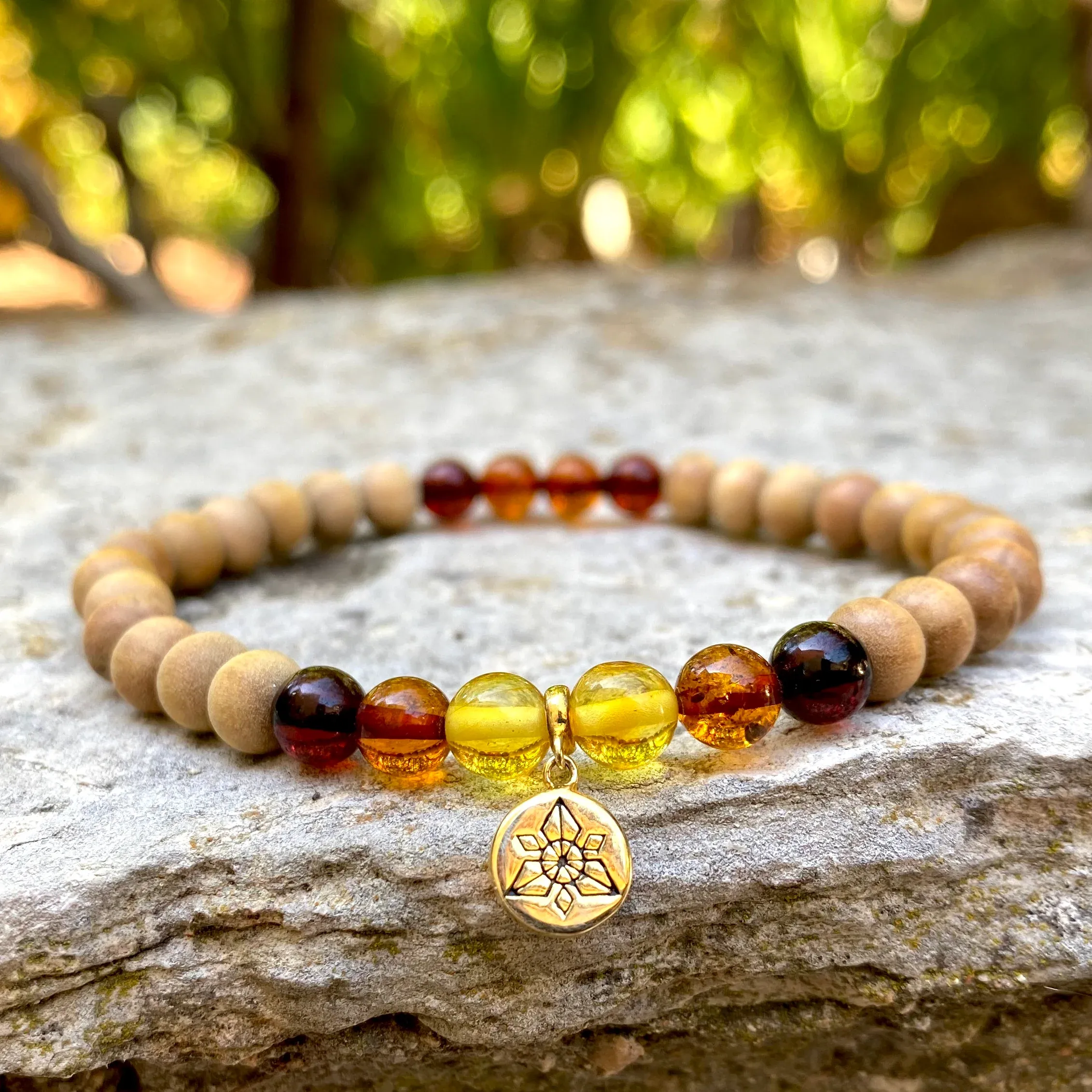 Bracelet réalisé à partir de perles d’exception, composé de plusieurs variétés d’Ambre de Lithuanie et du Bois de Santal de 6mm de diamètre en provenance d’Inde (région du Mysore). Il est composé d’un accessoire ANKORA en argent 925 plaqué or fin 18 carats.