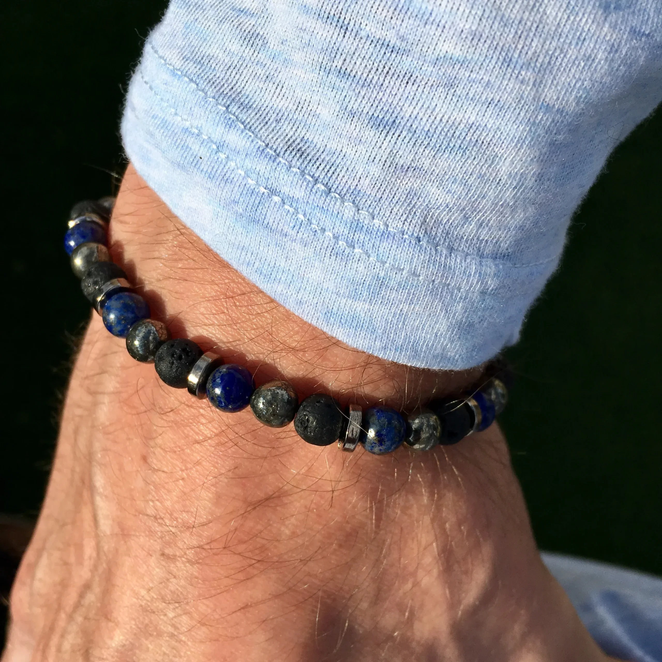Bracelet réalisé à partir de pierres naturelles de Lave, de Lapis lazuli et de Pyrite de 6 mm de diamètre.