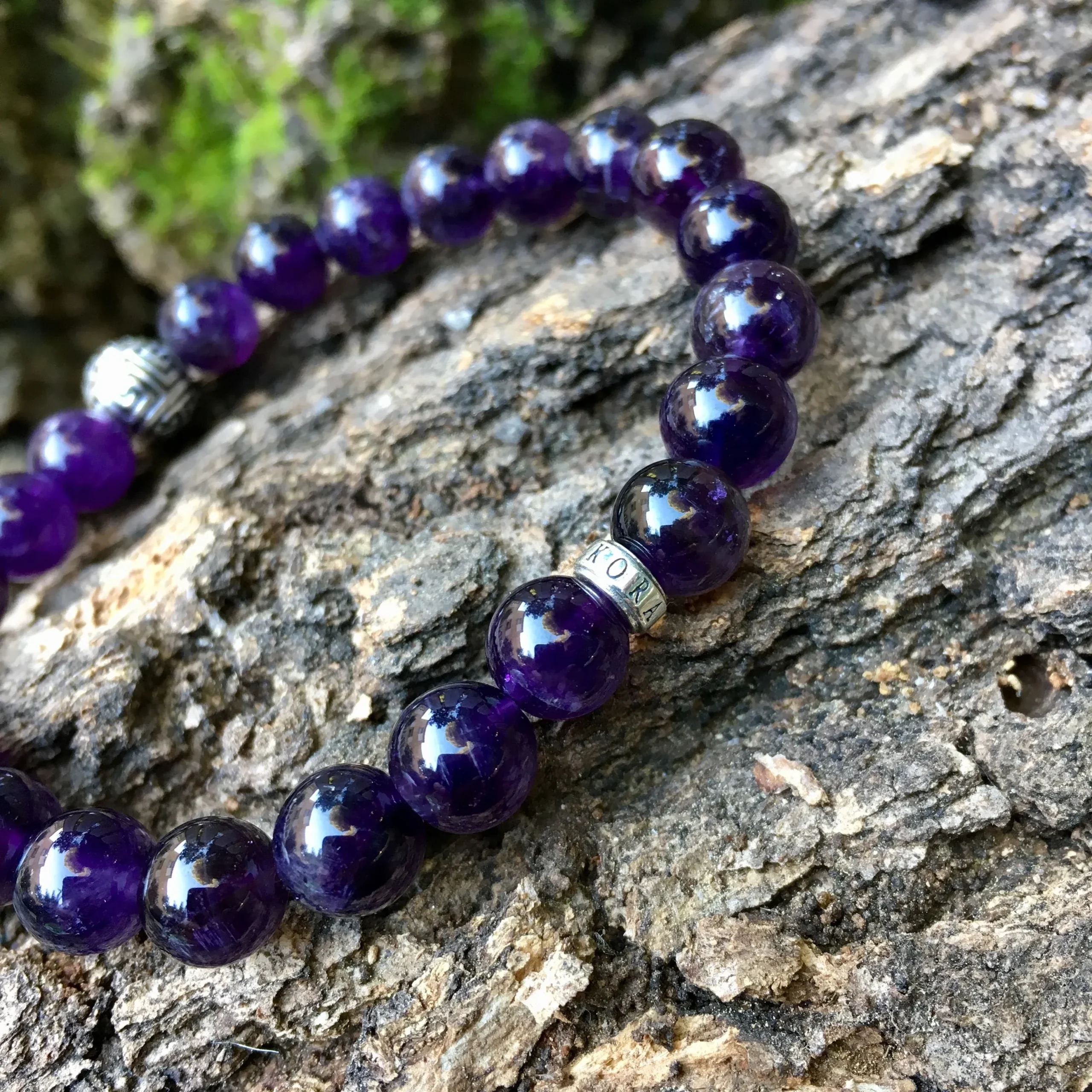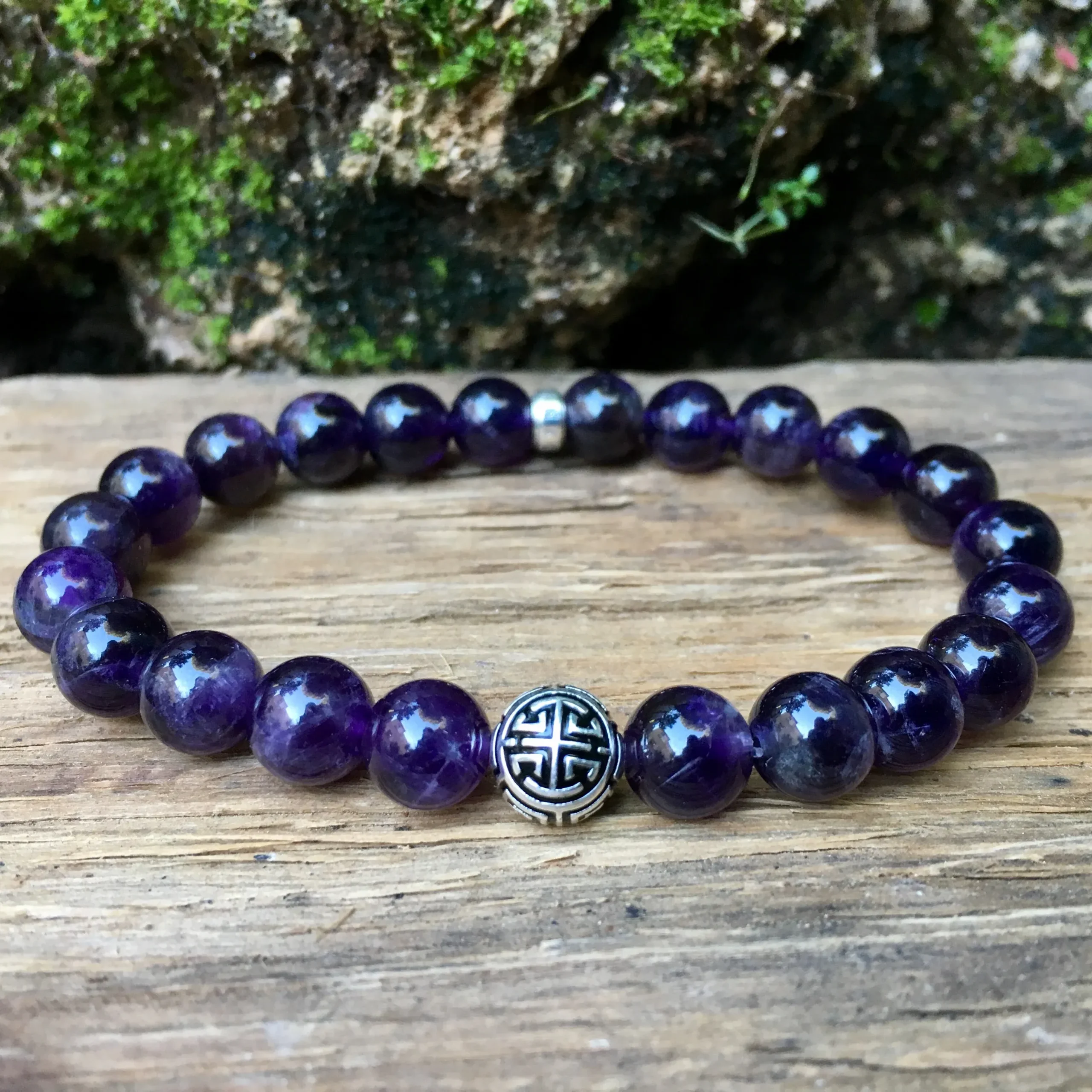 Bracelet réalisé à partir de pierres naturelles d’Améthyste de 8mm en provenance de Bolivie, d’un accessoire ANKORA, et du blessing « LU » en argent 925. Symbole spirituel apportant Chance et Prospérité à celui qui le porte.