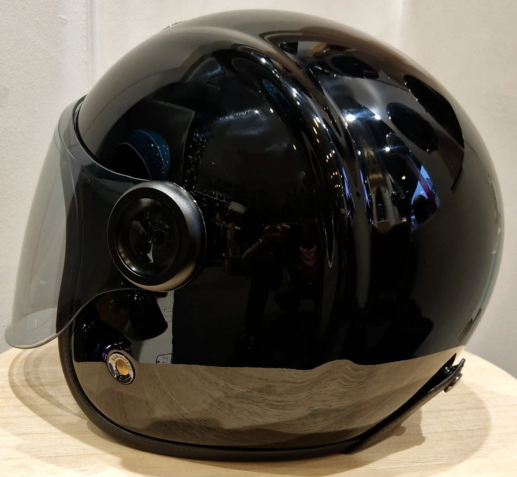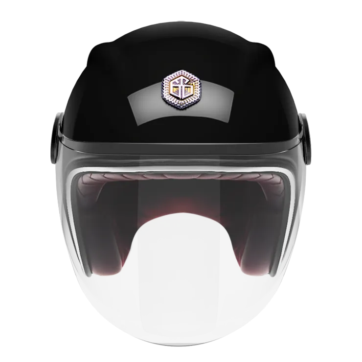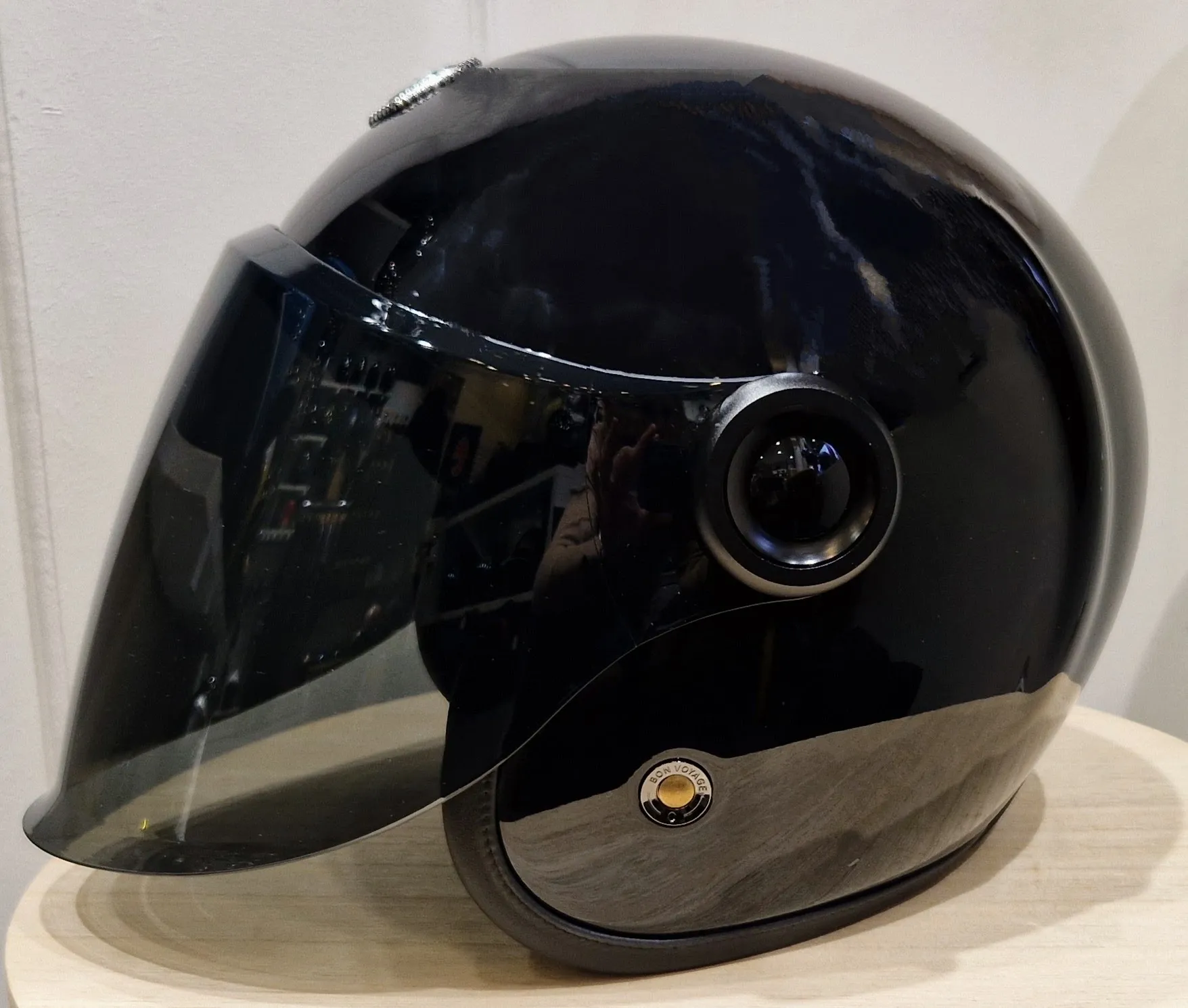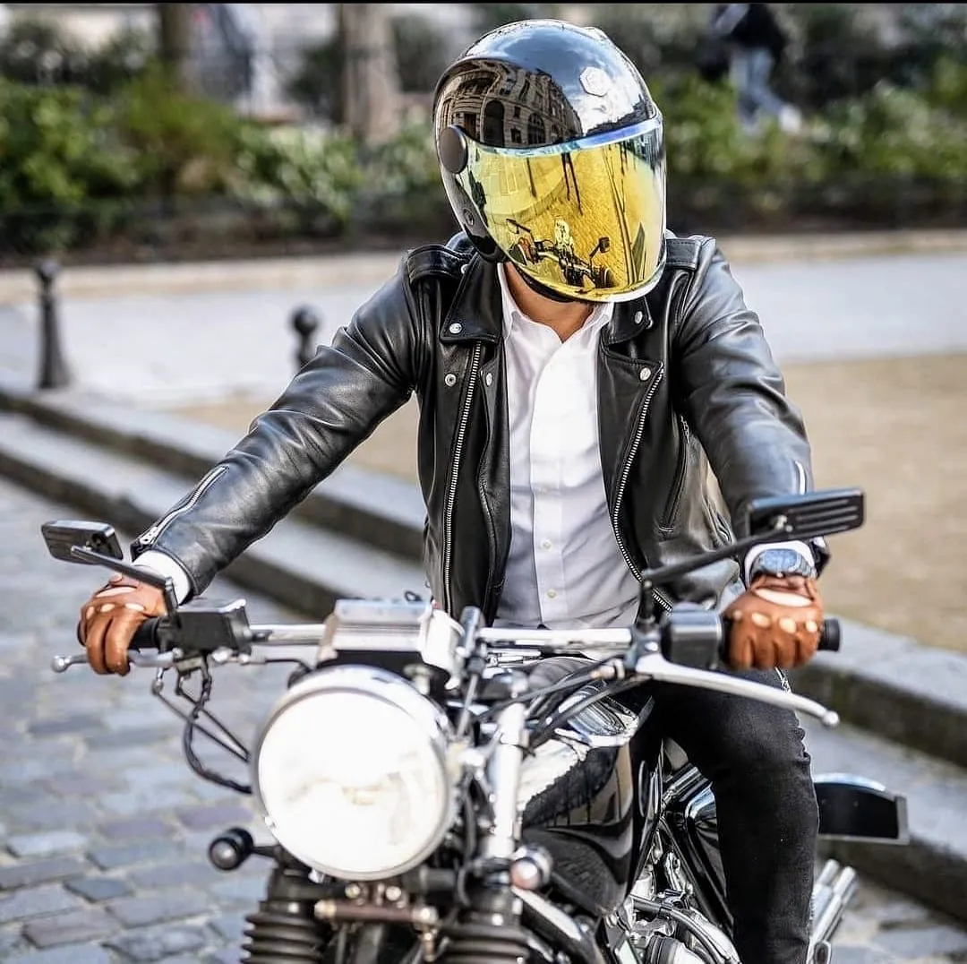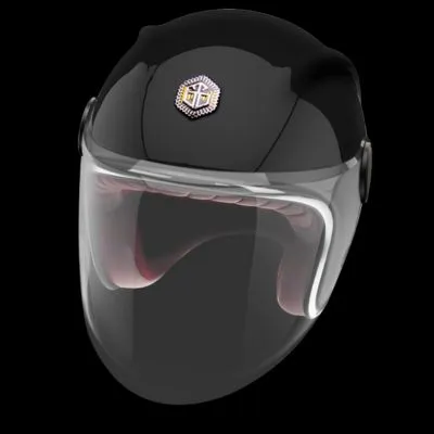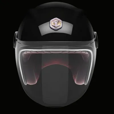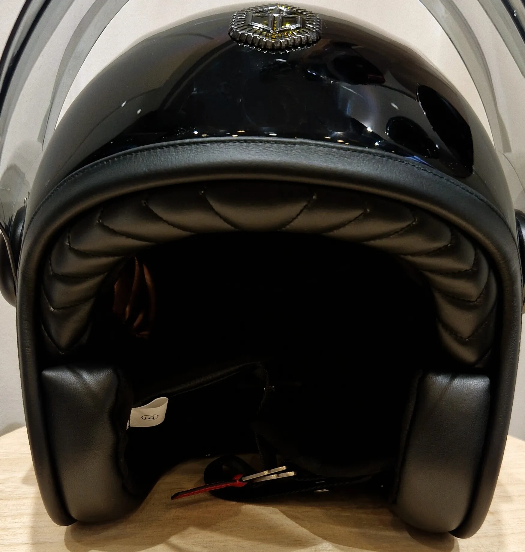 Nous retrouvons la forme caractéristique du jet Guang avec les deux “Cornes de dragon“ présentes de chaque côté du haut du casque, la coque en carbone renforcé héritage des industries aéronautique et spatiale, le jonc chromé ou la bordure cuir parfaitement ajusté, le cuir intérieur soyeux mélangé à la suédine, la fermeture double D et cette fameuse visière fixée par deux belles platines.