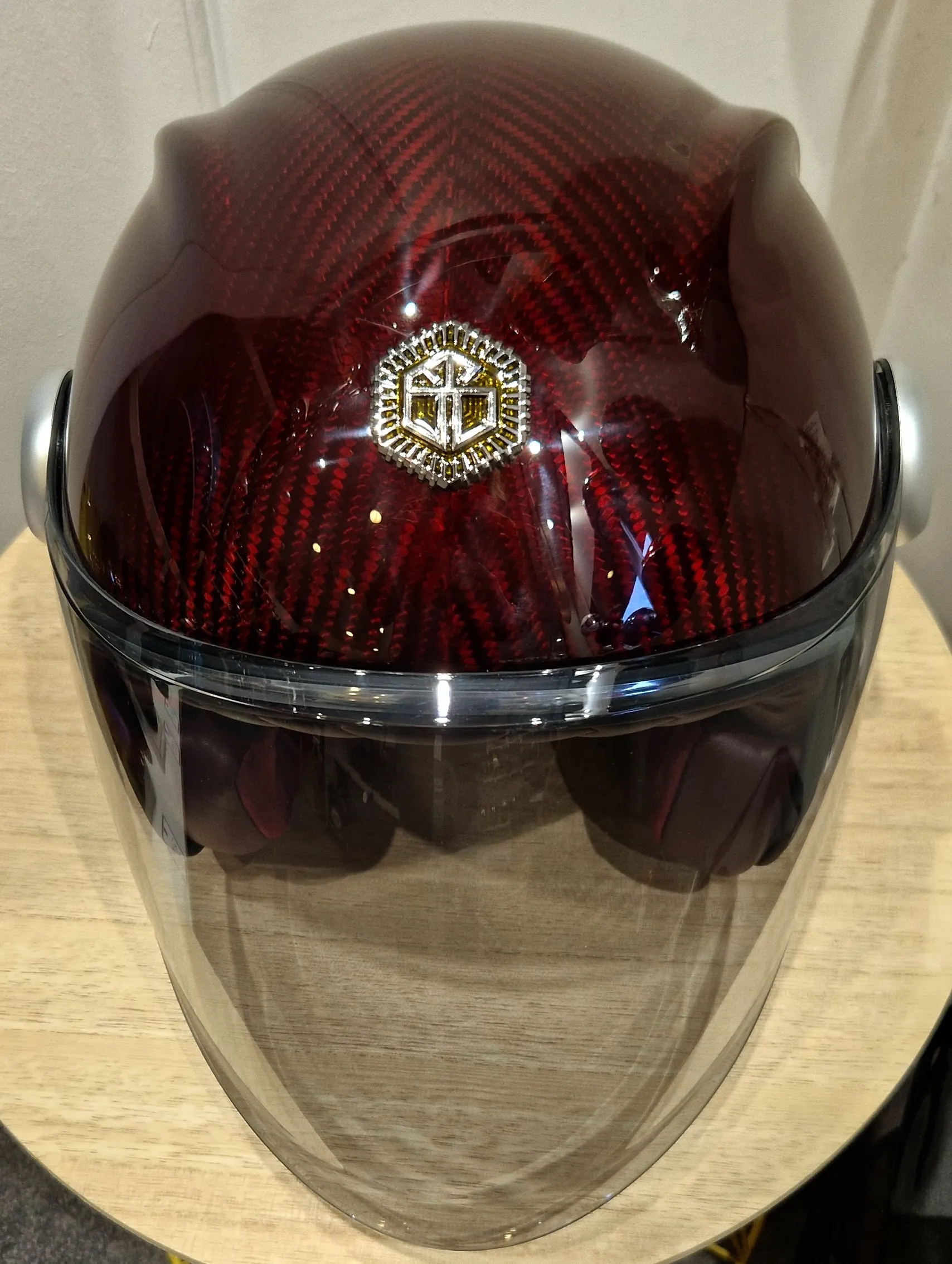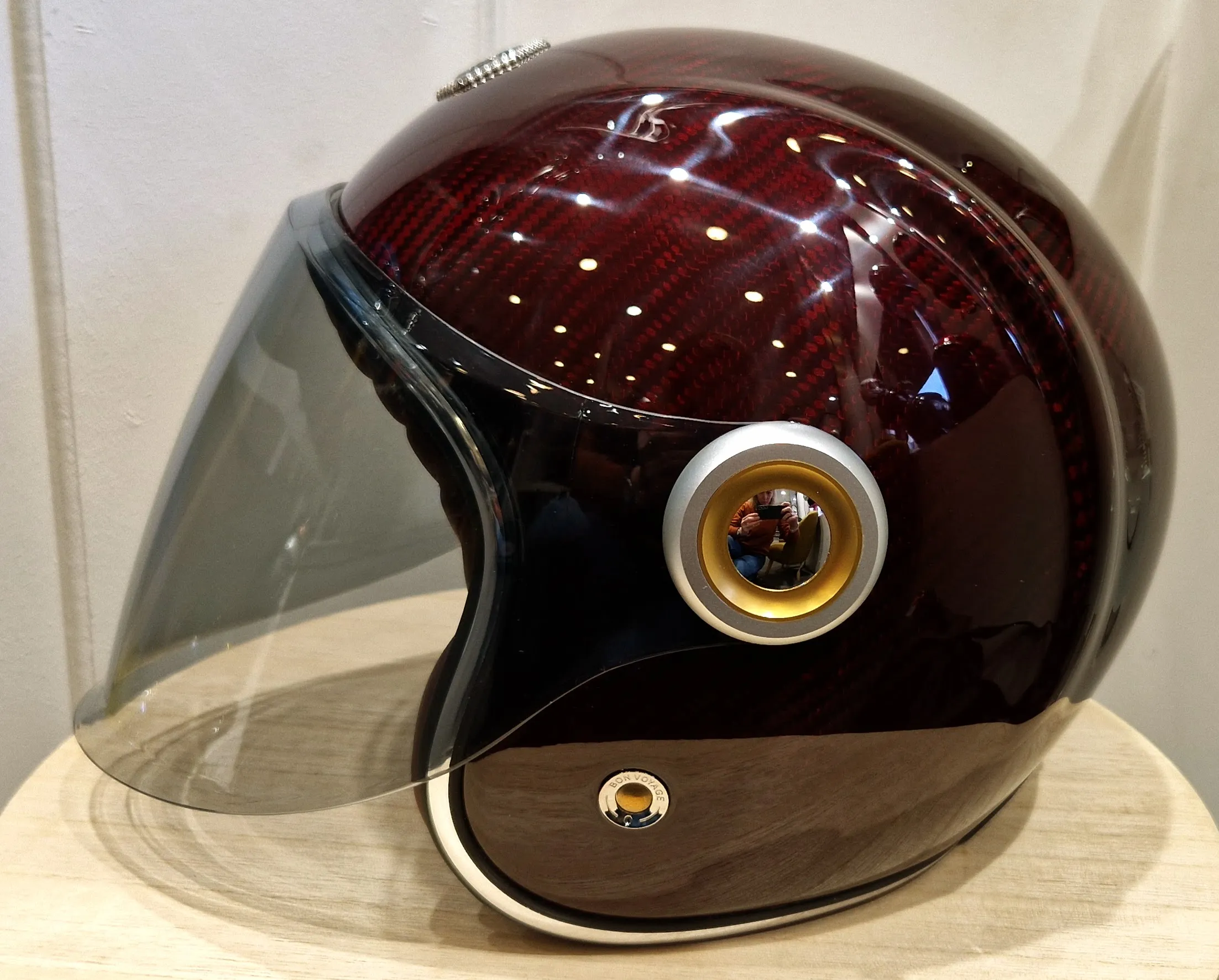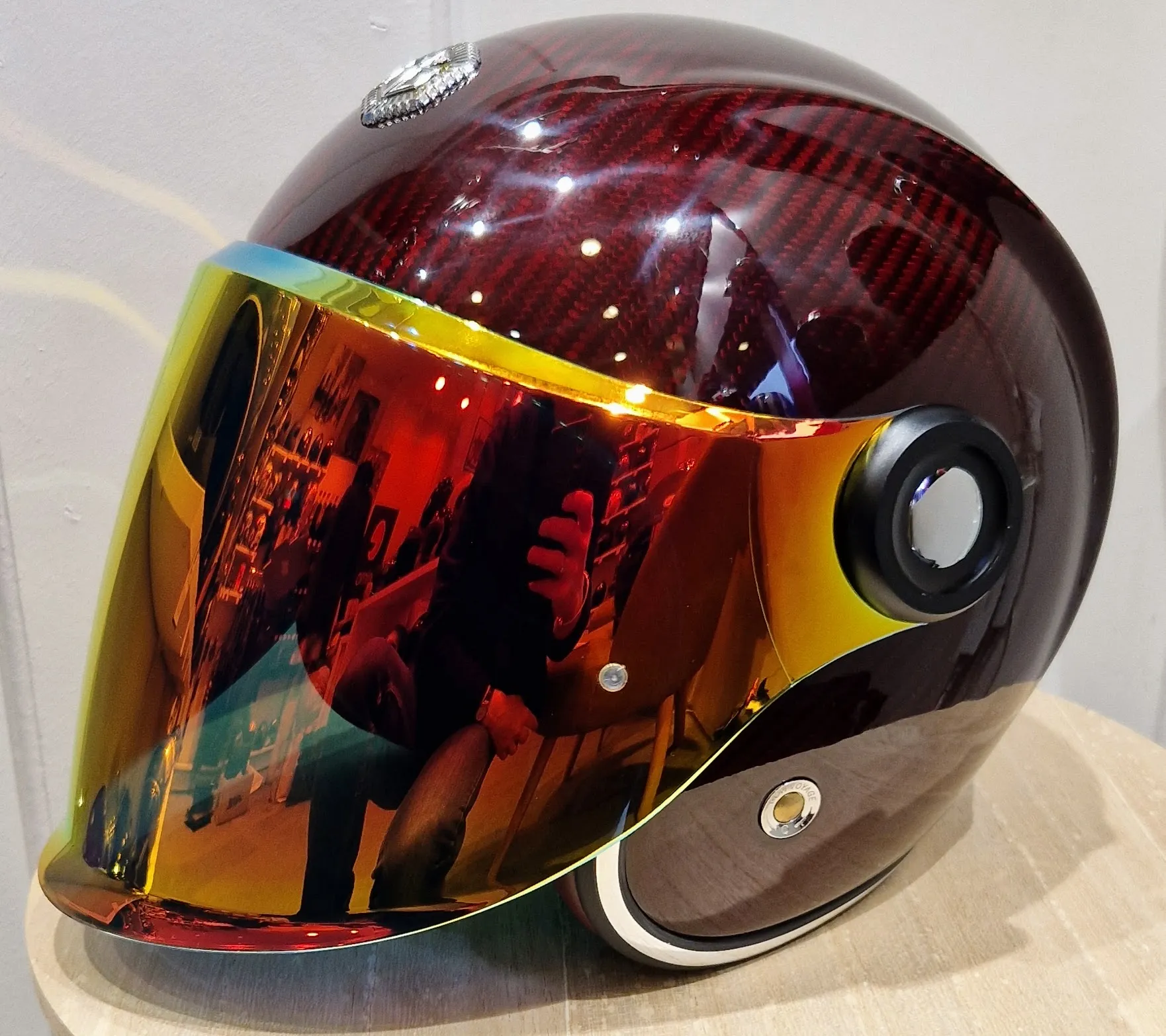Nous retrouvons la forme caractéristique du jet Guang avec les deux “Cornes de dragon“ présentes de chaque côté du haut du casque, la coque en carbone renforcé héritage des industries aéronautique et spatiale, le jonc chromé ou la bordure cuir parfaitement ajusté, le cuir intérieur soyeux mélangé à la suédine, la fermeture double D et cette fameuse visière fixée par deux belles platines.