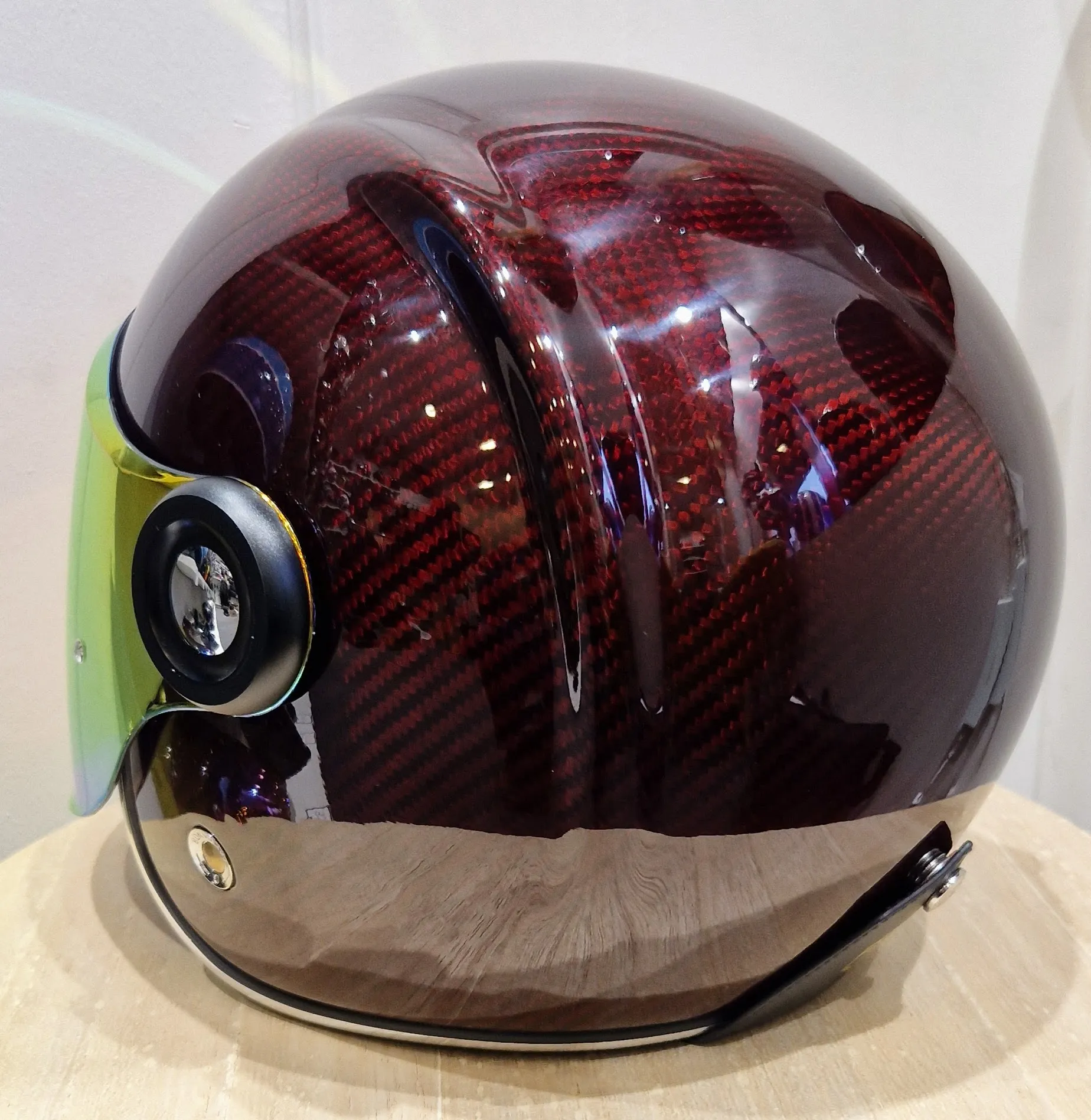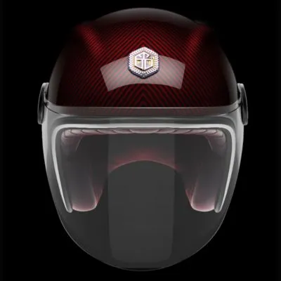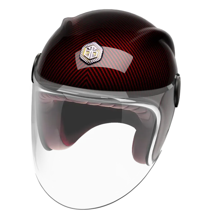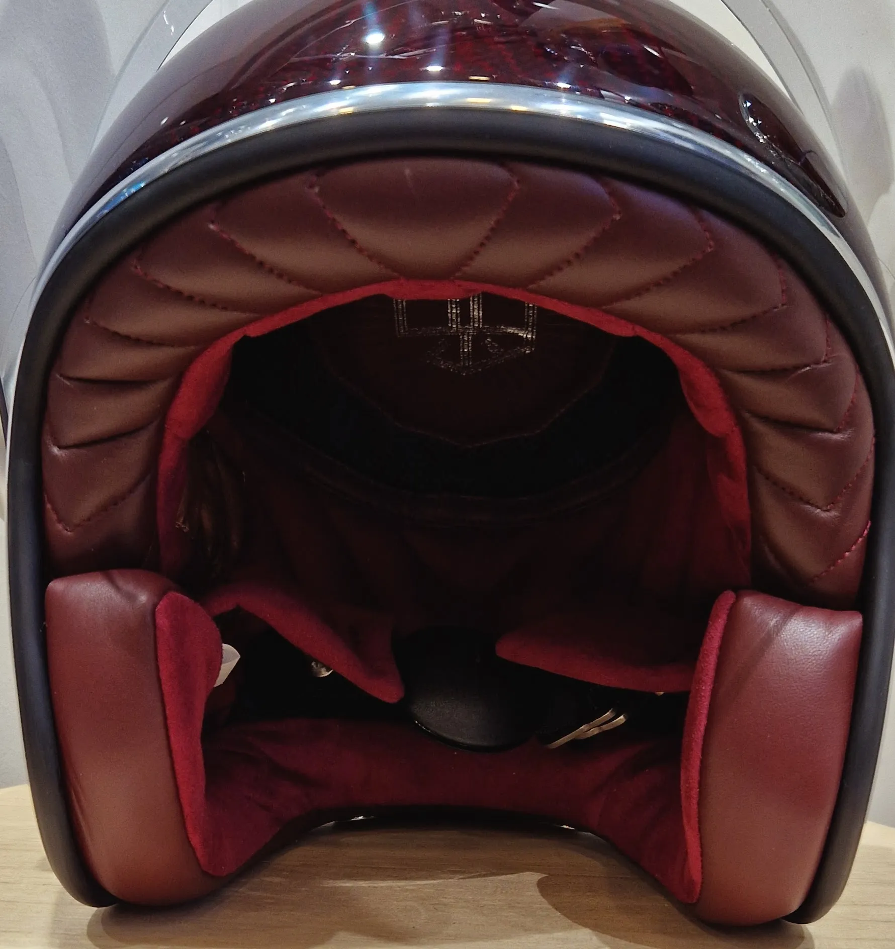 Nous retrouvons la forme caractéristique du jet Guang avec les deux “Cornes de dragon“ présentes de chaque côté du haut du casque, la coque en carbone renforcé héritage des industries aéronautique et spatiale, le jonc chromé ou la bordure cuir parfaitement ajusté, le cuir intérieur soyeux mélangé à la suédine, la fermeture double D et cette fameuse visière fixée par deux belles platines.