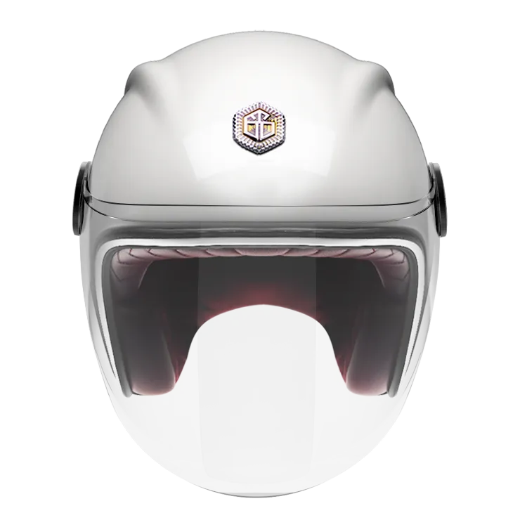 Nous retrouvons la forme caractéristique du jet Guang avec les deux “Cornes de dragon“ présentes de chaque côté du haut du casque, la coque en carbone renforcé héritage des industries aéronautique et spatiale, le jonc chromé ou la bordure cuir parfaitement ajusté, le cuir intérieur soyeux mélangé à la suédine, la fermeture double D et cette fameuse visière fixée par deux belles platines.