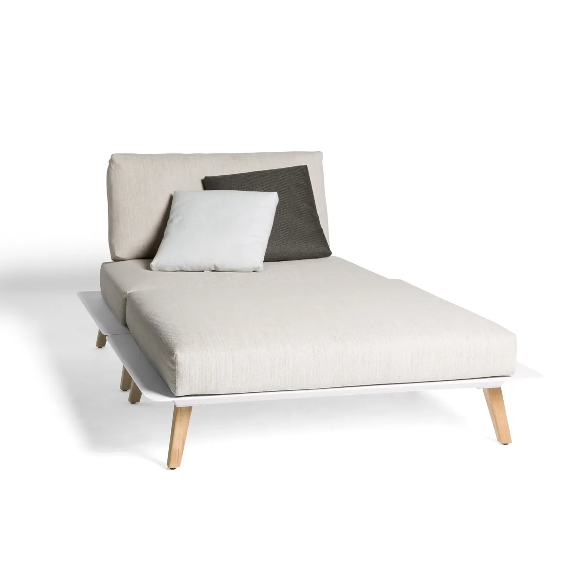 La structure repose sur un cadre en aluminium verni à la poudre blanche, ce qui lui assure une grande résistance aux conditions météorologiques et un entretien aisé. L’aluminium, choisi pour sa légèreté et sa durabilité, est fini avec un revêtement en poudre blanche qui complémente l’esthétique moderne et épurée de la méridienne.