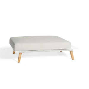 Les pieds en teck massif donnent un contraste naturel et élégant avec la base blanche de la structure. Ce bois est prisé pour son excellente tenue dans le temps, surtout en extérieur, et il ajoute une touche de chaleur naturelle au design global.