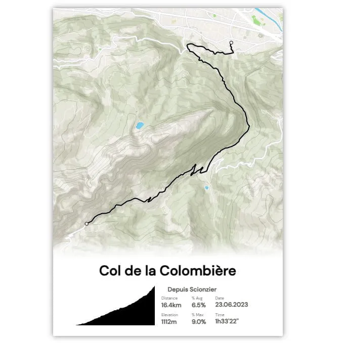 Cette affiche de l’ascension du Col de la Colombière depuis Scionzier est imprimée sur du papier brillant haute qualité.