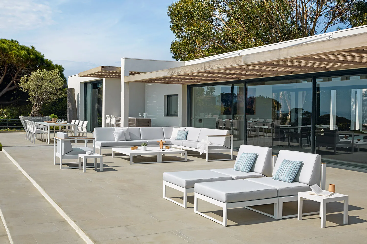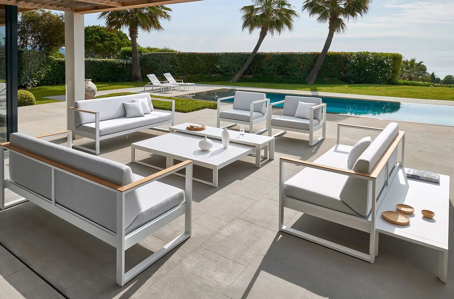 Finition teckLa combinaison de l’aluminium thermolaqué avec des accoudoirs et des sièges en teck naturel ajoute une touche chaleureuse. |