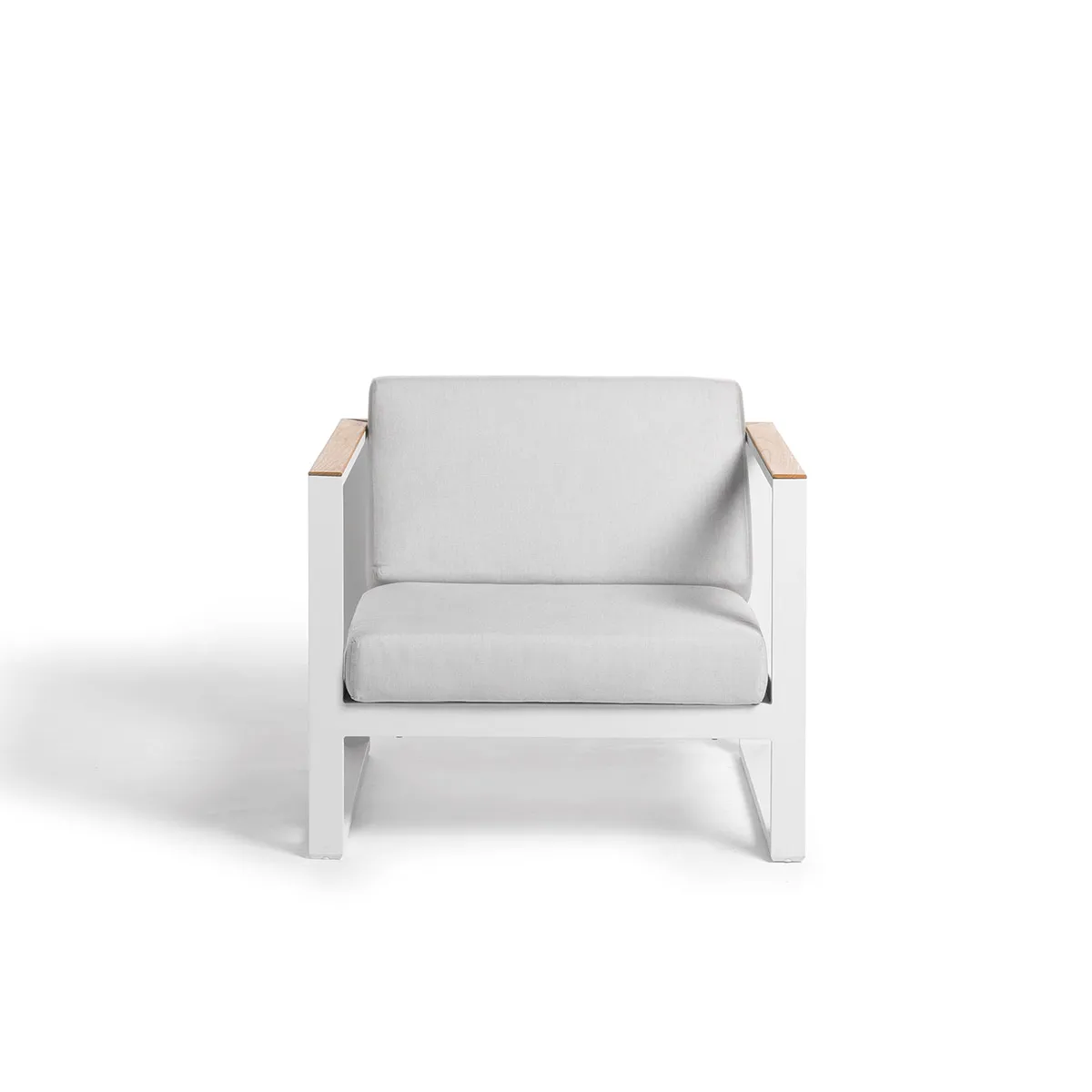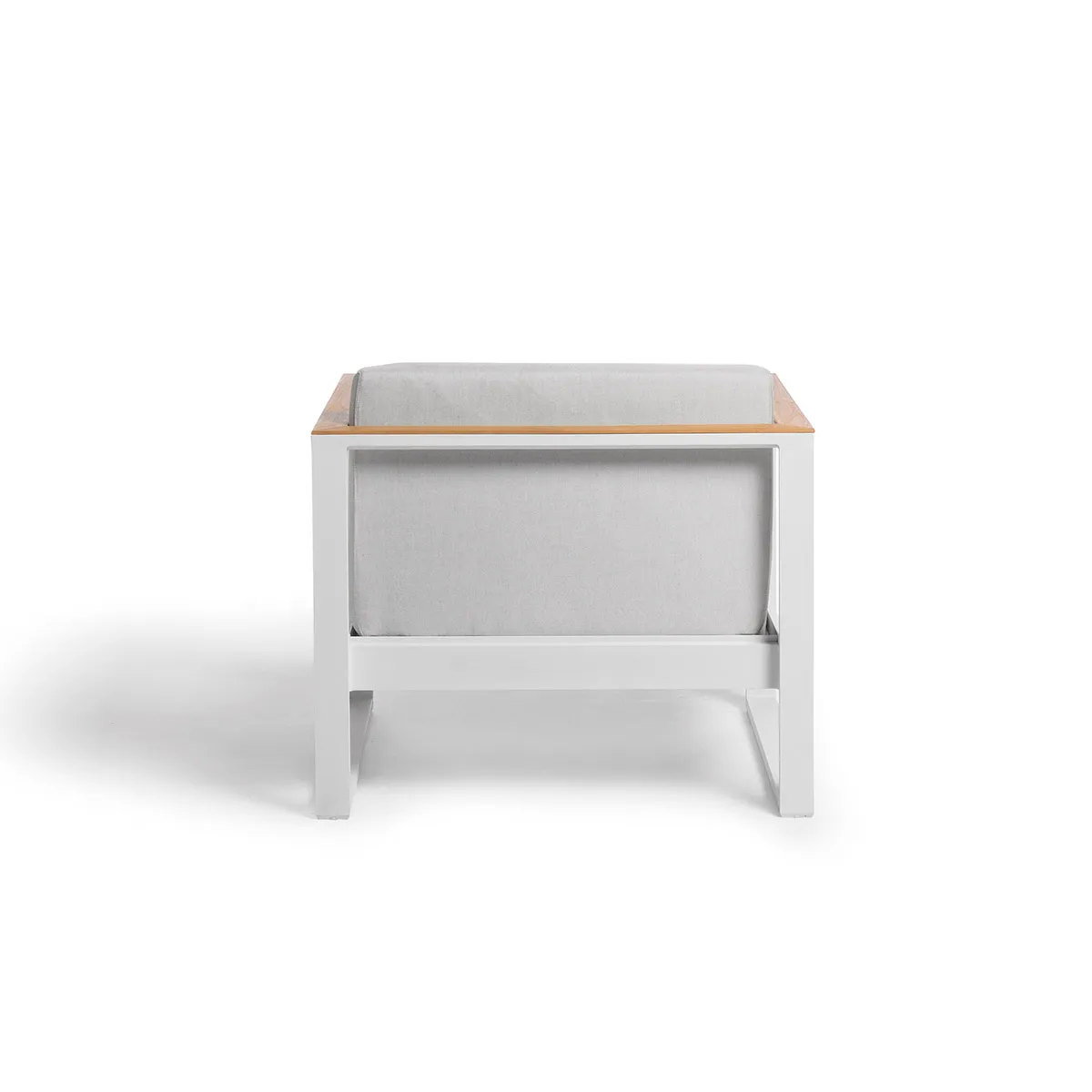 Détails et dimensionsFauteuil extérieur, structure en aluminium verni à la poudre blanche. Accoudoirs revêtus en teck Dimensions : |