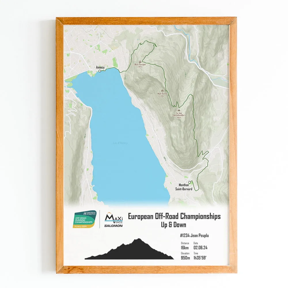 This print of the 2024 European Off-Road Championships Elite Up & Down course is printed on high-quality glossy photo paper. To create a personal and unique poster, add your bib number, first name, last name, finishing time, or any text you wish. You can do this in the text fields available below.