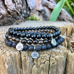 Bracelet triple « Protection » Tourmaline noire, Lave, Quartz fumé – 6 mm